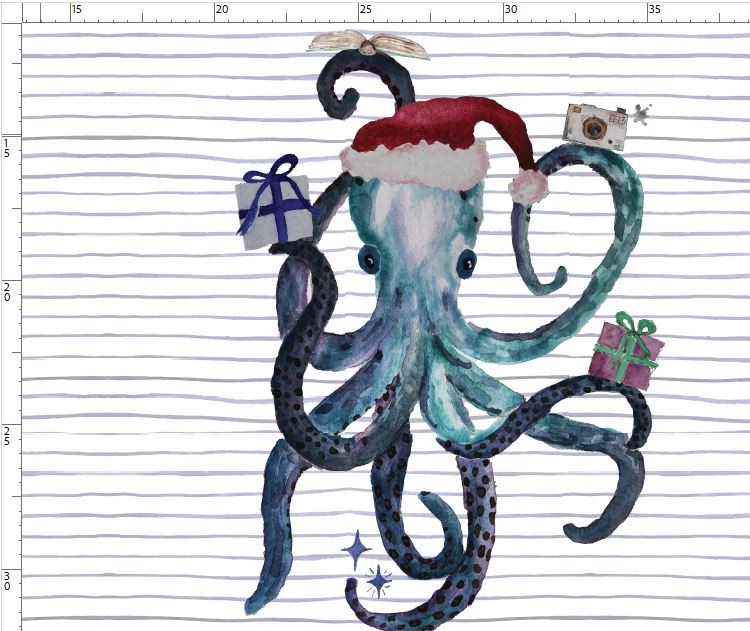 An extraordinary holiday design – the "Christmas Booktopus" panel features a playful octopus with books and festive details, including a Santa hat. Set against a subtle striped background, this panel becomes a unique eye-catcher for your creative projects. Perfect for accessories, decorations, or clothing with a whimsical, maritime flair!
